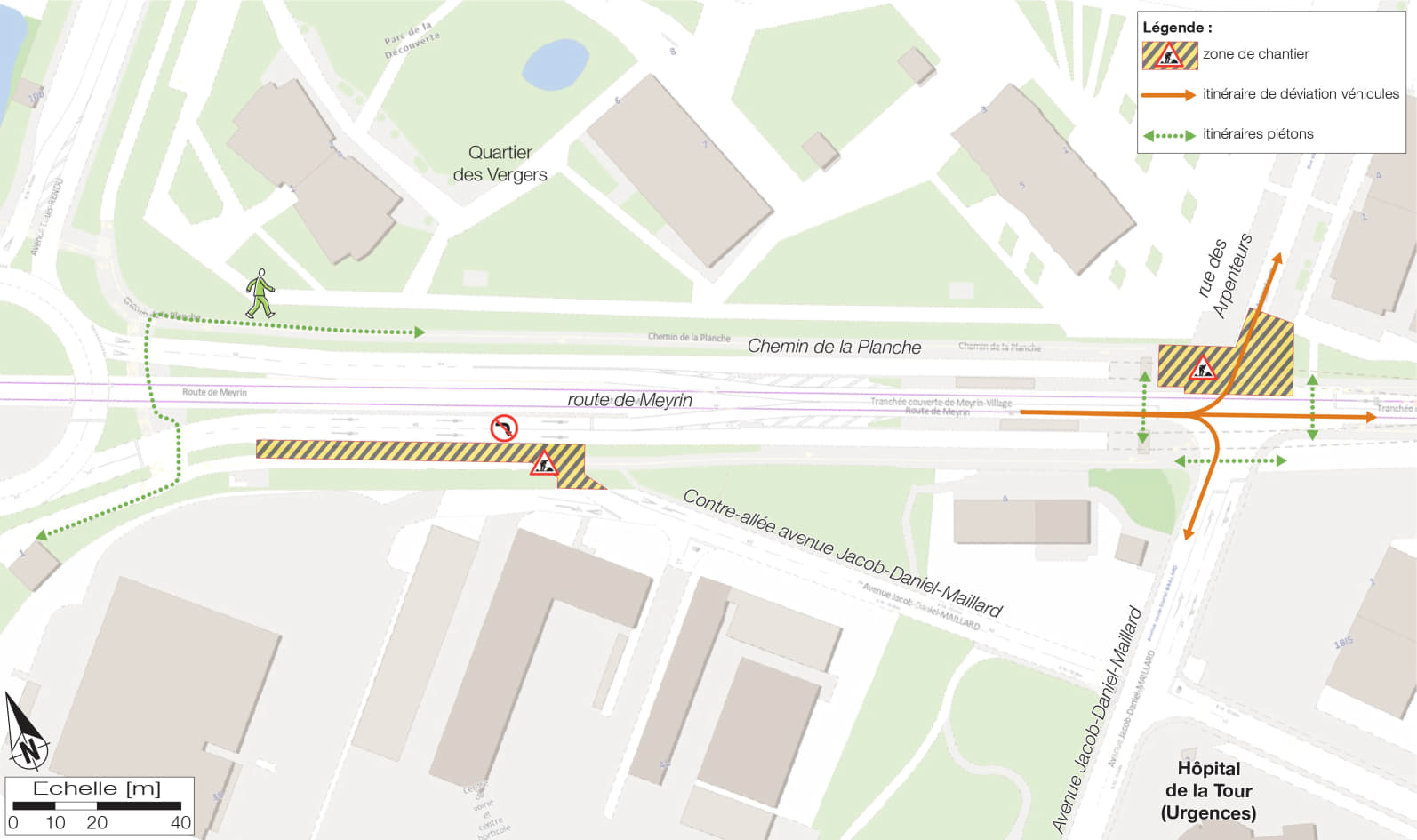 - Interdiction de tourner à droite depuis la route de Meyrin vers la contre-allée de l'avenue Jacob-Daniel-Maillard. Accès au quartier des Vergers et aux urgences de l'hôpital de la Tour garantis par la route de Meyrin (voir déviations indiquées sur l'infographie).