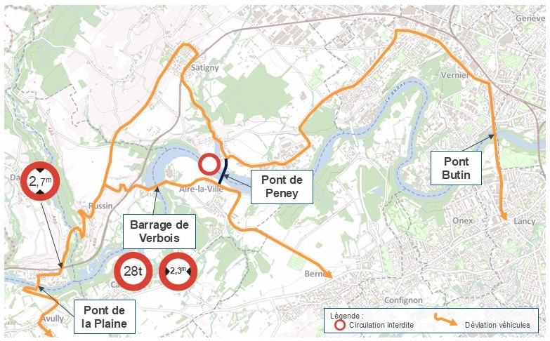 Pour assurer la correspondance entre les arrêts "Pont de Peney" et "Bois-de-Bay", la traversée du pont doit se faire à pied.