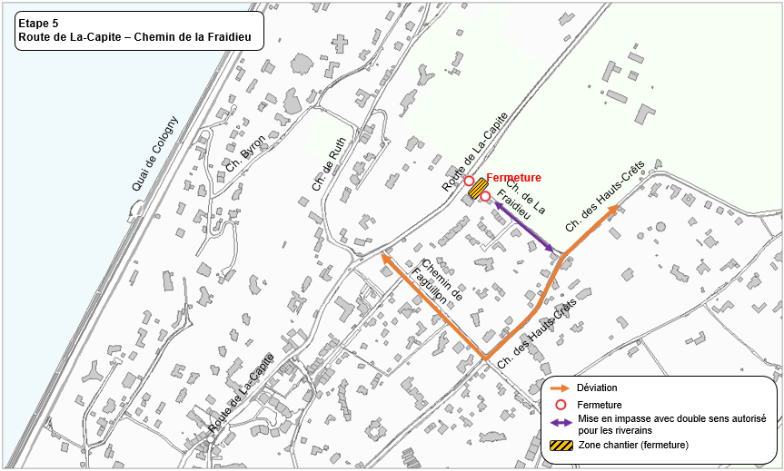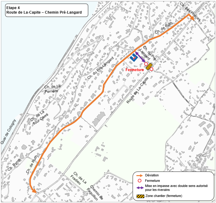 - Mise en impasse du chemin de Ruth entre le chemin du Nant-d'Argent et le n°47 route de La-Capite, avec arrêts TPG "Cologny, Mairie" déplacés