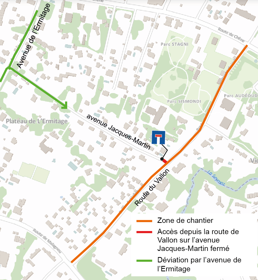 - Fermeture de l'accès à l’avenue Jacques-Martin depuis la route du Vallon. Accès riverain par l’avenue de l’Ermitage pendant cette période.