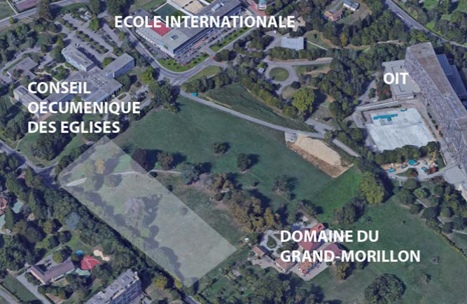 Cette carte montre l'emplacement de la future Cité internationale du Grand Morillon, parcelle située dans le Jardin des Nations à l'angle entre la route de Ferney et la route des Morillons.