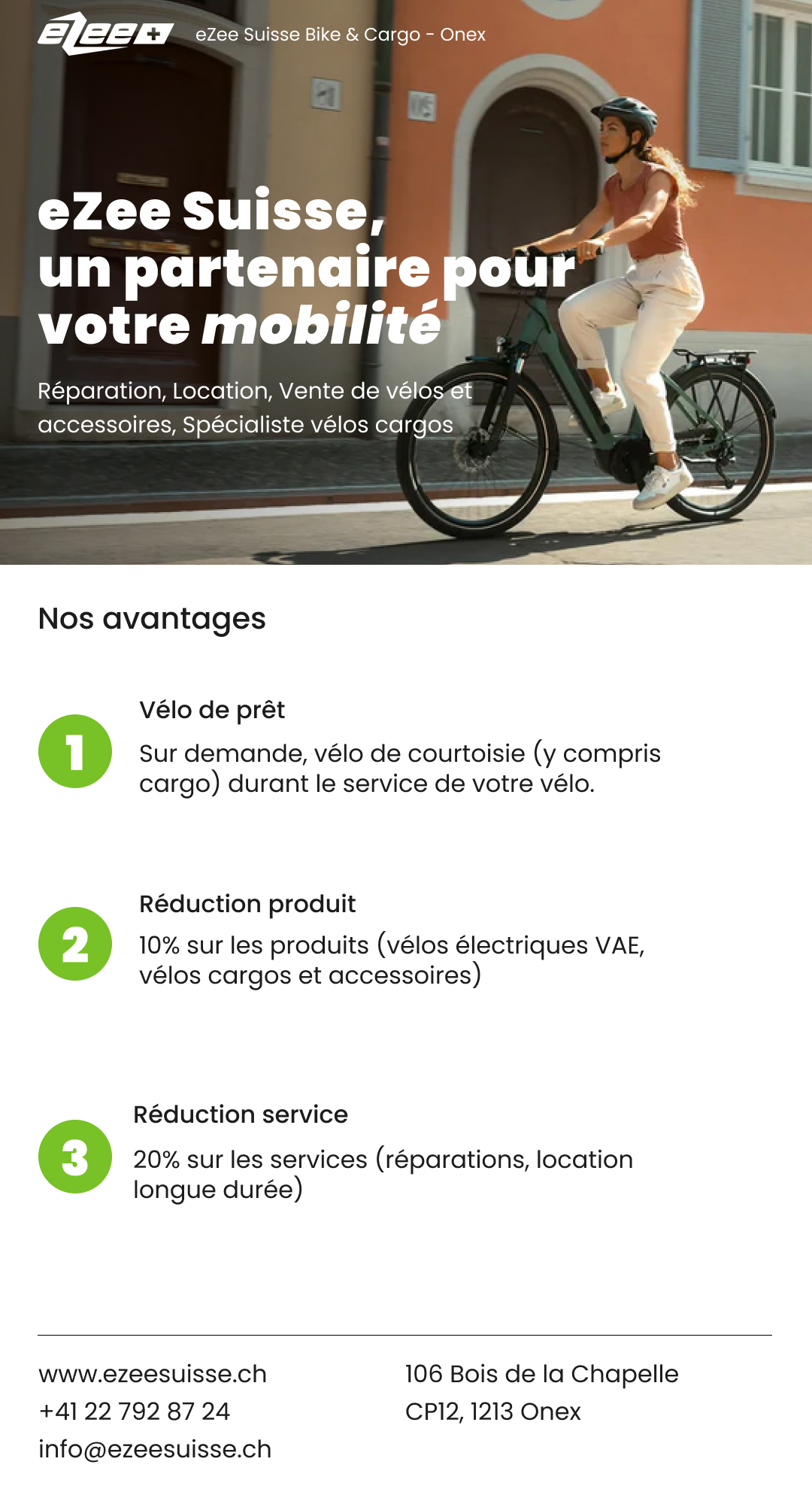 Flyer d'informations sur l'entreprise eZee Bike et Cargo, proposant des offres dans le cadre de la démarche des Rabais d'entreprise.