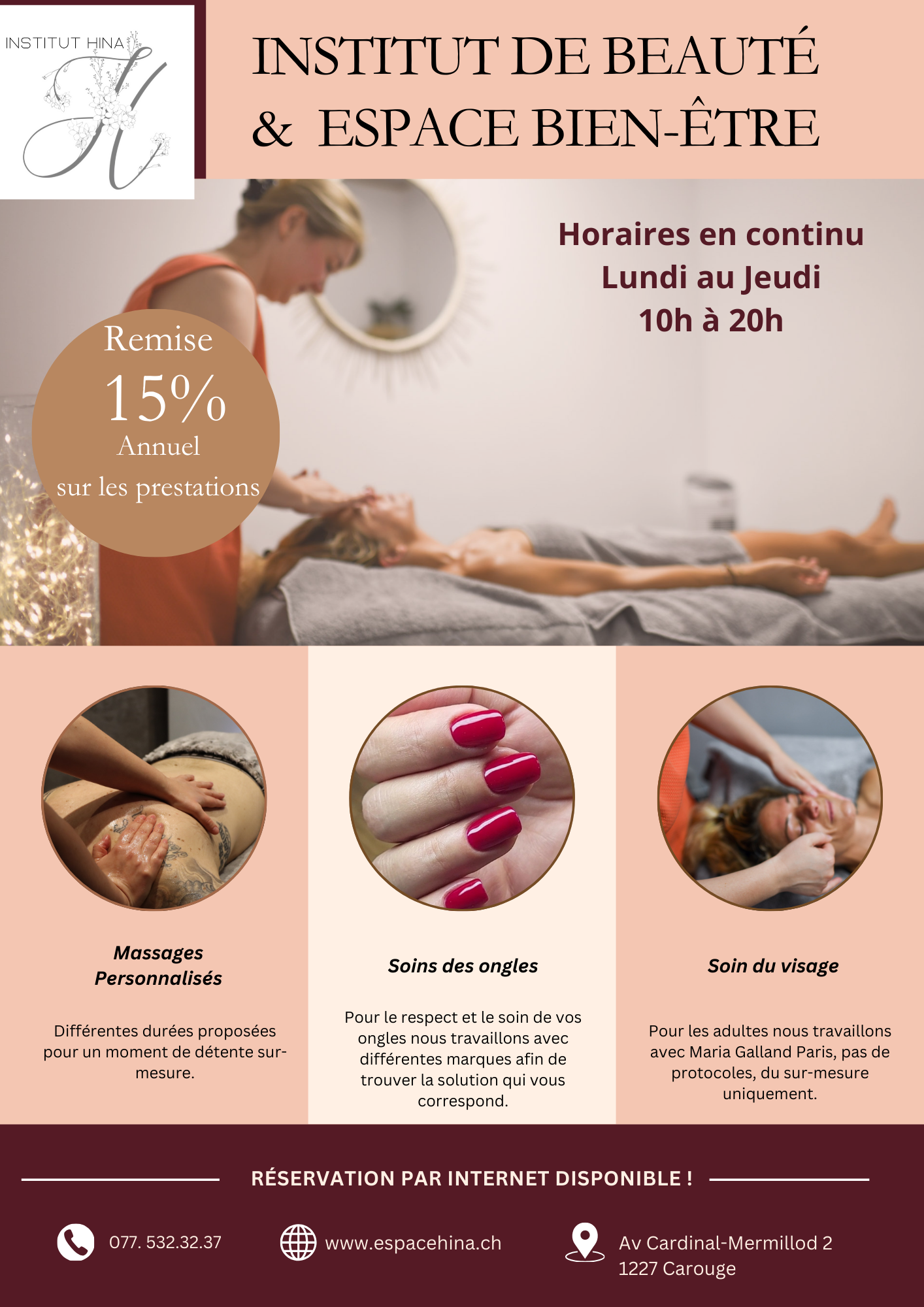 Flyer d'informations sur les offres proposées par l'institut de beauté et de bien-être Hina, dans le cadre de la démarche des Rabais d'entreprises