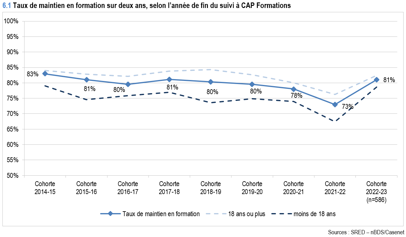 Le taux de maintien en formation s’élève à 81% (Fig. 6.1). Ce taux connaît une hausse de 8 points par rapport à la cohorte précédente. Plutôt stable entre 2014-15 et 2019-20, il avait connu une diminution significative pendant deux ans, avant de remonter lors de cette dernière période d'observation. Plusieurs hypothèses peuvent être avancées pour expliquer la hausse du taux de maintien en formation. D’une part, il est possible que les jeunes qui ont réussi à reprendre une formation après CAP Formations connaissent des difficultés moins marquées. D’autre part, le soutien apporté aux jeunes avant de reprendre une formation (préparation au choix d’orientation notamment) et durant la formation reprise peut aussi réduire les risques d’interruption, et donc augmenter les chances de maintien en formation. Notons aussi que cette hausse concerne autant les mineurs que les majeurs, bien que ces derniers soient légèrement plus nombreux à persévérer dans la formation reprise (82% contre 79%).